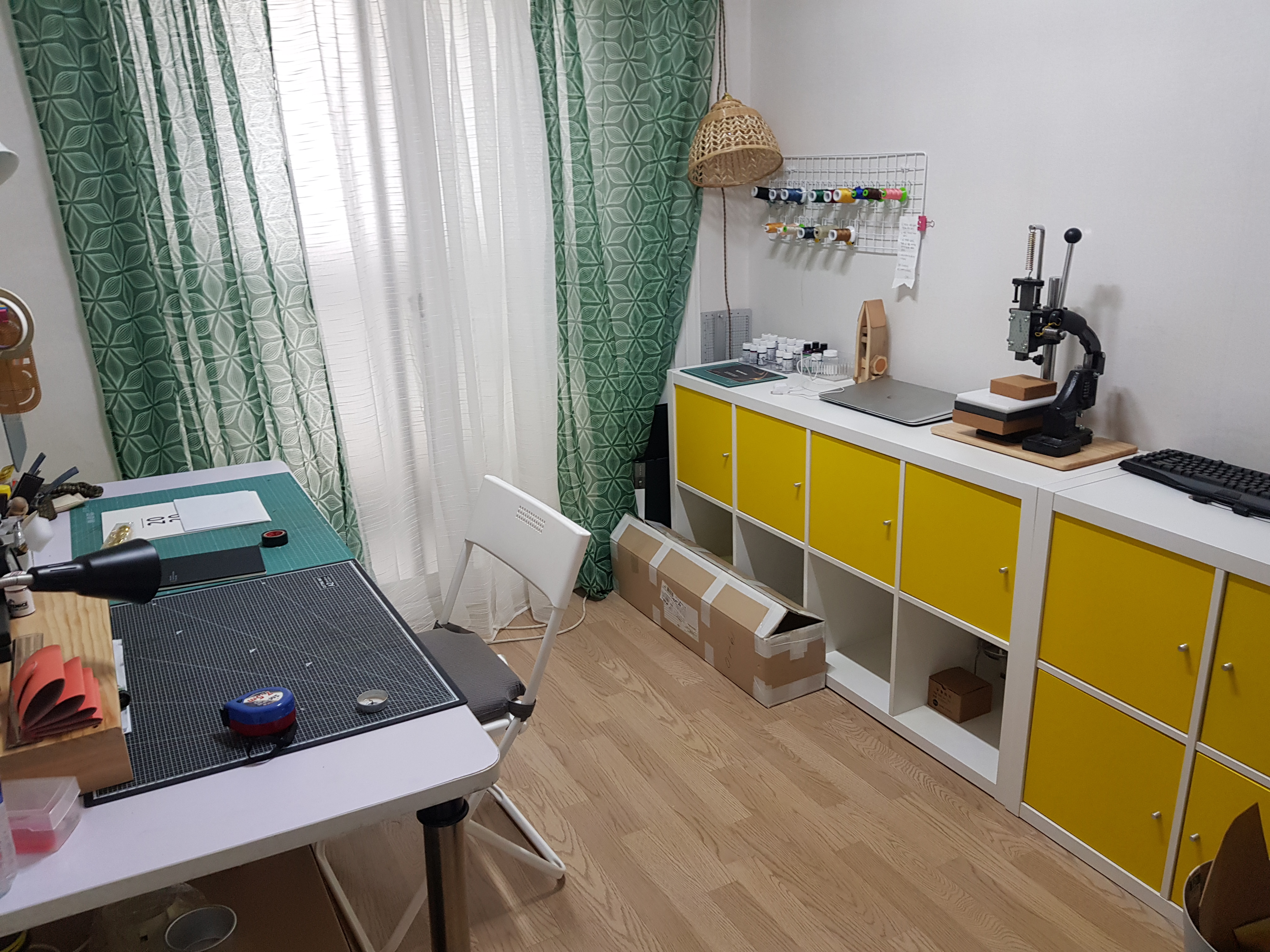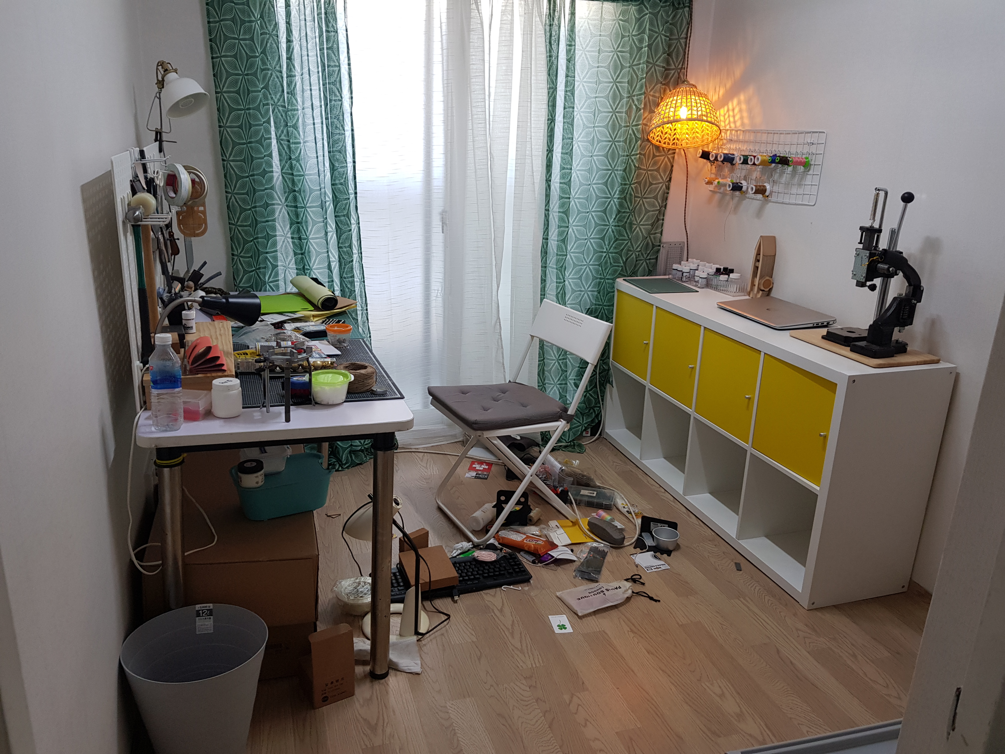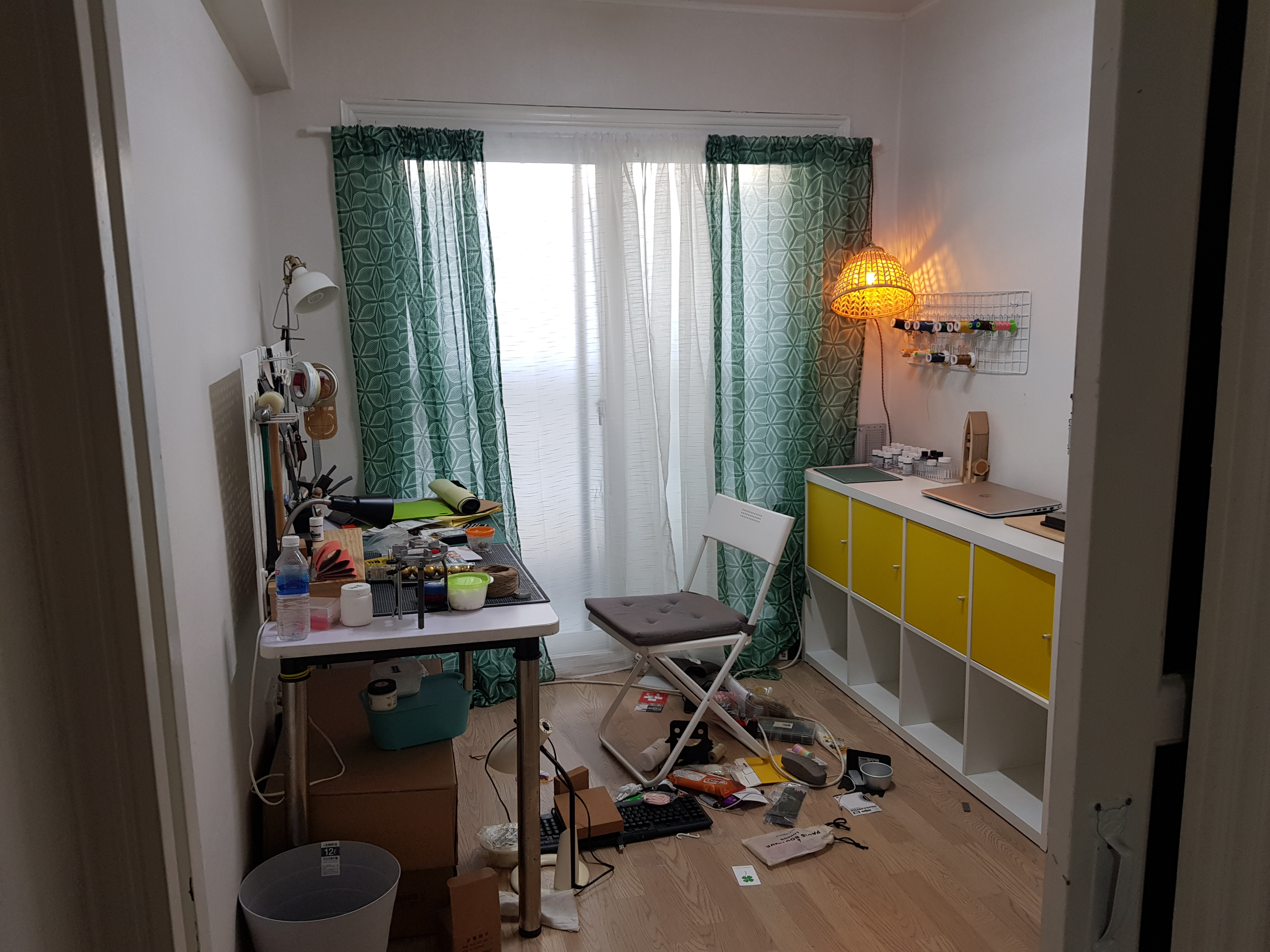 안보이는 책꽂이를 먼저 정리하고, 바닥에 위험하게 널려있는 공구들을 모두 칼락스 위로 옮겼어요.