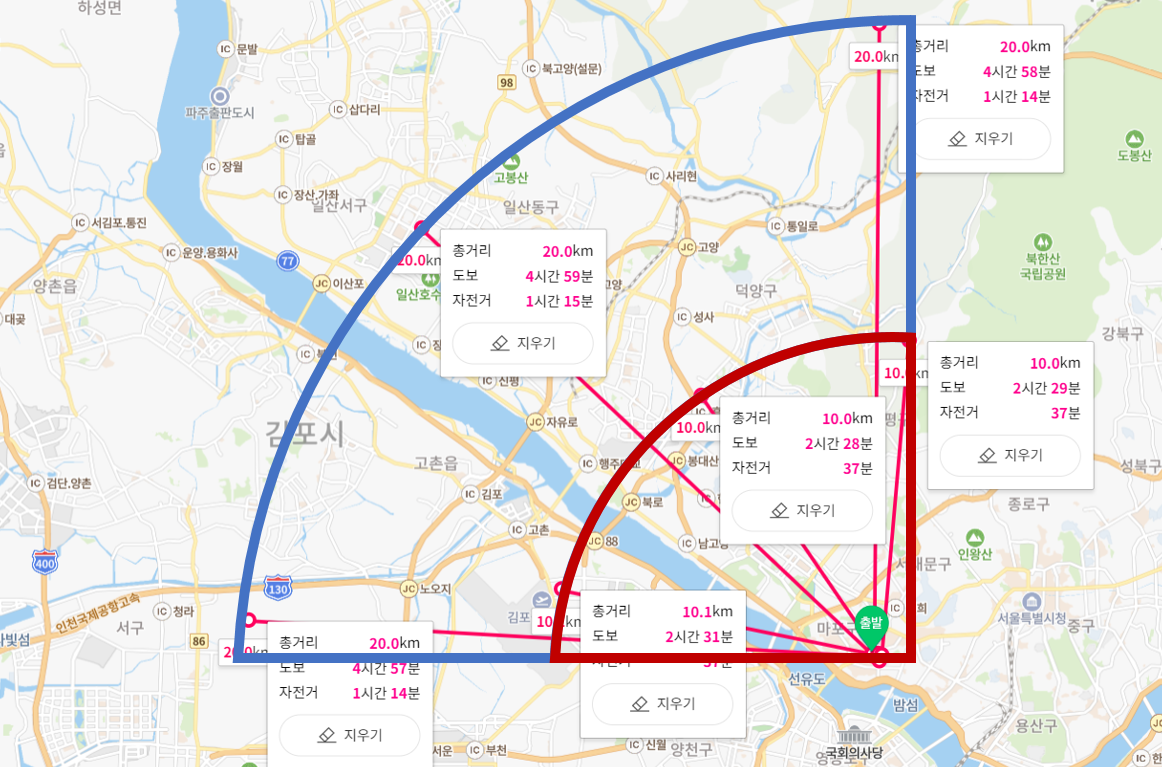 사무실에 점 찍어놓고 5km단위로 원을 그렸어요.